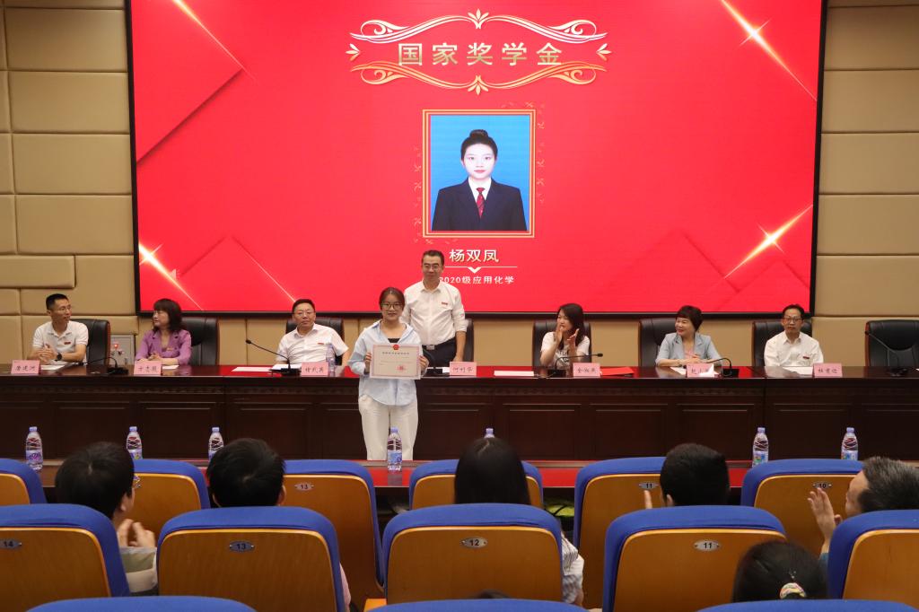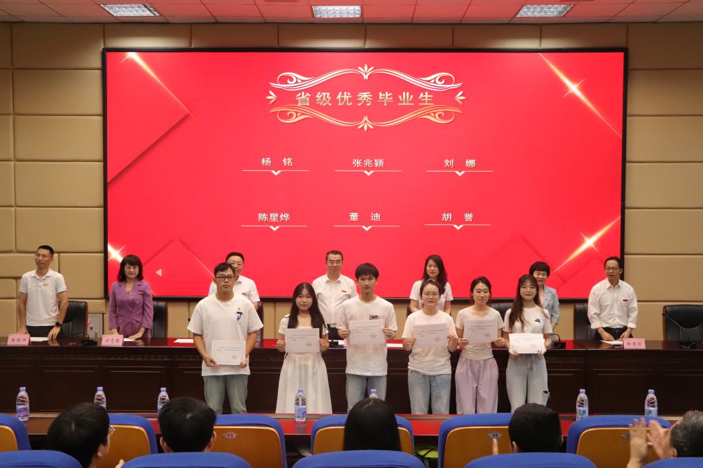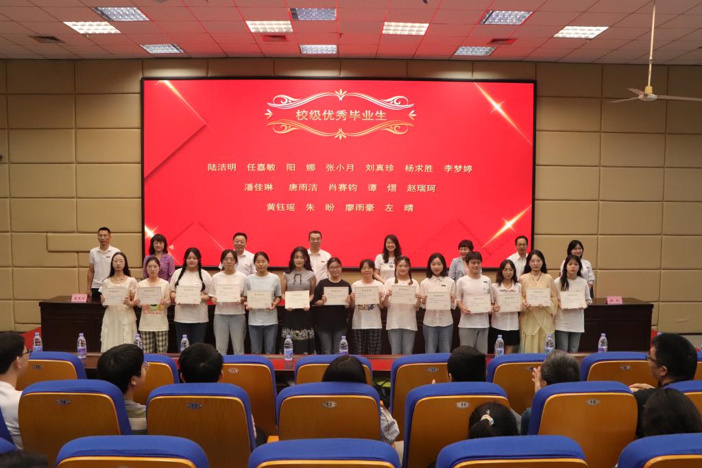 杨双凤同学获评国家奖学金;任嘉敏等9名同学获评国家励志奖学金;杨铭等6名同学获评湖南省优秀毕业生;陆洁明等16名同学获评长沙学院优秀毕业生;高义朋等70名同学考取硕士研究生,获评升学奖。主席台的各位领导、老师为获奖同学颁发获奖证书并合影留念。