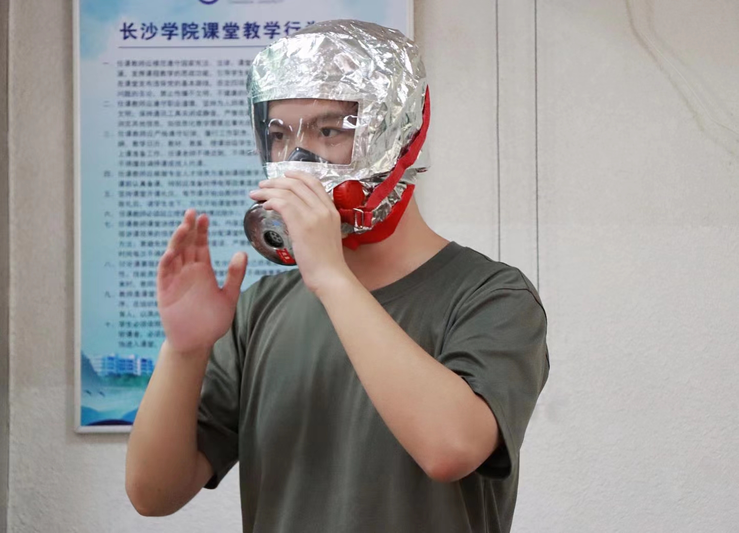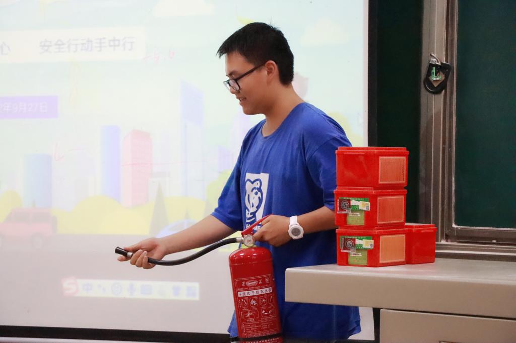 活动的第一阶段为校园消防安全讲座。邓尧老师从常见的校园消防安全事故、学生宿舍常见的消防隐患、火灾中如何逃生、如何科学处置火情、如何正确报火警等5个方面,用案例分析、实物演示、模拟操作等形式为同学们上了一堂形式生动、内容丰富的校园消防安全课。邓尧老师现场为同学们演示了干粉灭火器的正确使用方法和防毒面具的正确穿戴方法,为同学们讲解火场逃生技能,为生命护航。他呼吁同学们提高消防安全意识,养成良好的用电、用火习惯,特别注意宿舍禁烟和不使用违规电器,做到“人离电断”。