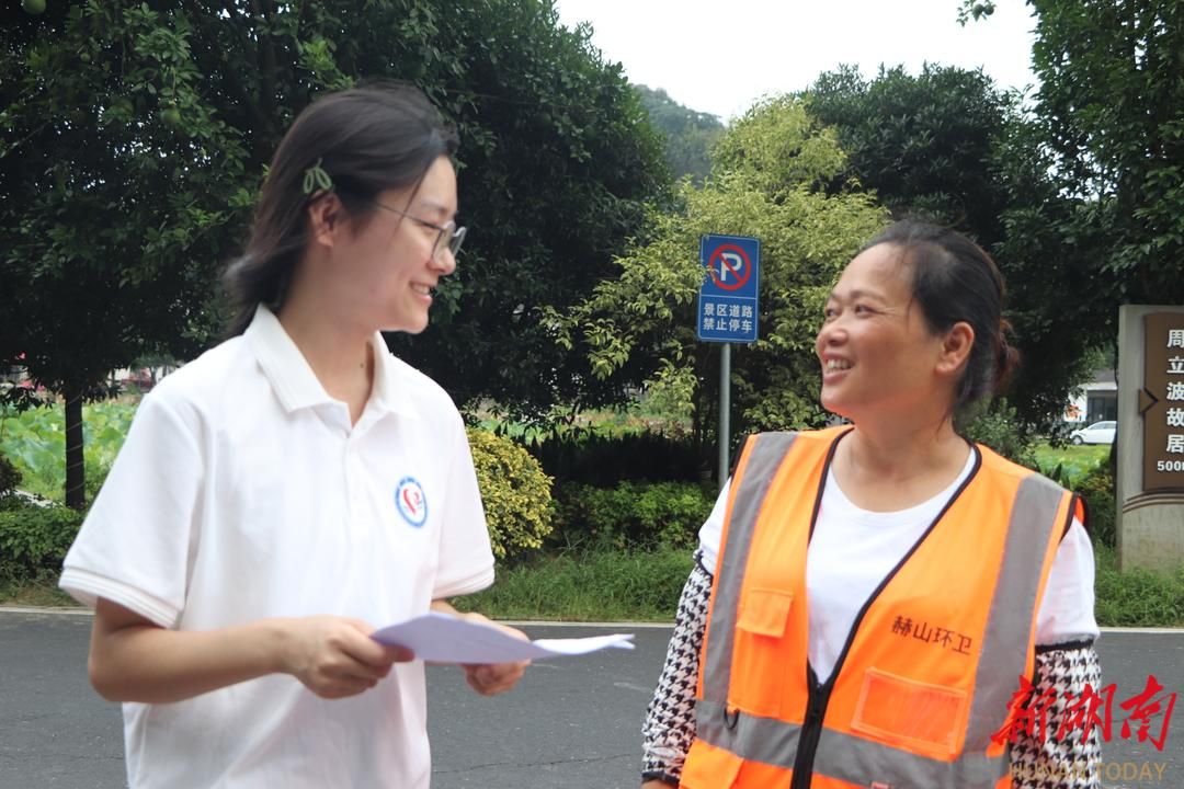 图为实践团成员李荣荣采访清溪村环卫工人进行清溪村生态环境调研