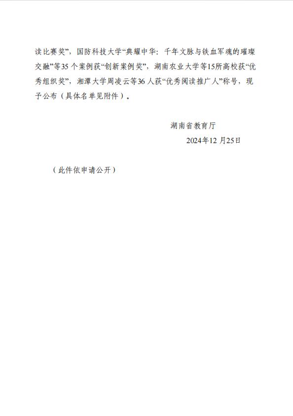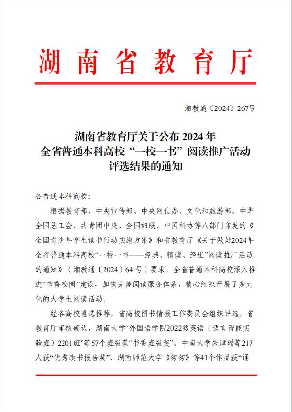 近日,湖南省教育厅发布了《关于公布2024年全省普通高等学校“一校一书”阅读推广活动评选结果的通知》,我院报送的《“红色书香 品读美好”——四维沉浸阅读体验活动》获“创新案例奖”;2023级生物工程01班获“书香班级奖”二等奖。