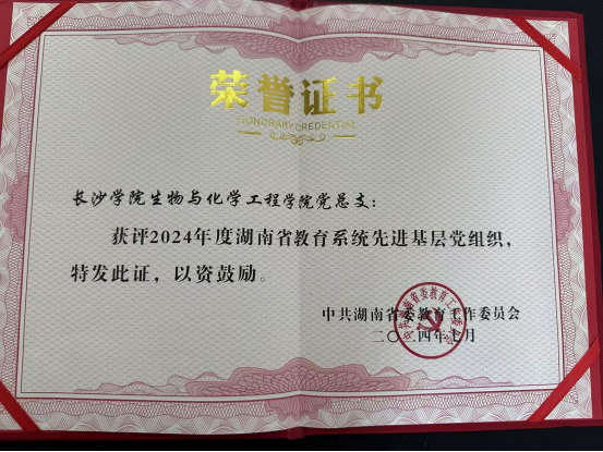 2024年7月31日,中共湖南省委教育工委下发《关于表彰全省教育系统优秀共产党员、优秀党务工作者和先进基层党组织的通报》(湘教工委通〔2024〕25号),对在加快建设教育强省的新征程上,全省教育系统涌现出来的优秀个人和先进集体进行表彰。长沙学院生物与化学工程学院党总支获评“湖南省教育系统先进基层党组织”称号。