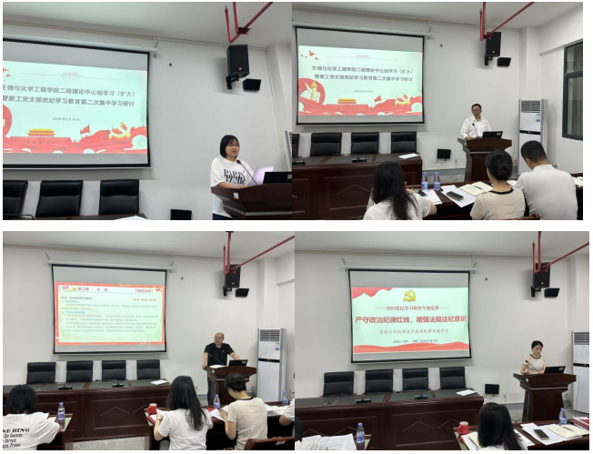 2024年5月14日下午,生物与化学工程院开展二级党组织理论学习中心组(扩大)学习暨党纪学习教育第二次集中学习。通过会前自学、讨论交流的形式,原文学习《中国共产党纪律处分条例》(以下简称《条例》)第二编的第六章和第七章。全体党总支委员、教工支部委员及教师党员参加学习。