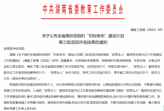 近日,中共湖南省委教育工委发布了《关于公布全省高校党组织“对标争先”建设计划第三批项目评选结果的通知》(湘教工委通[2023]4号),确定了第三批全省高校党建工作示范高校7所、标杆院系51个、样板支部100个、“双带头人”教师党支部书记工作室培育创建单位11个、“双带头人”标兵102名、党务工作示范岗102个、青年教工党员示范岗101个。长沙学院生物与化学工程学院党总支获评全省高校党建“标杆院系”。