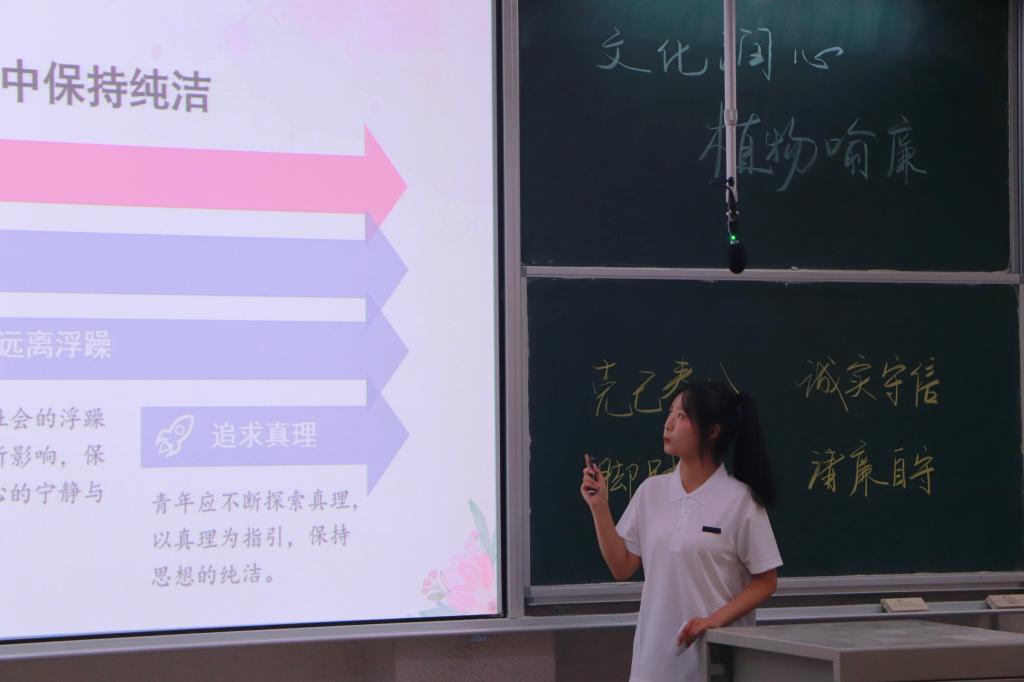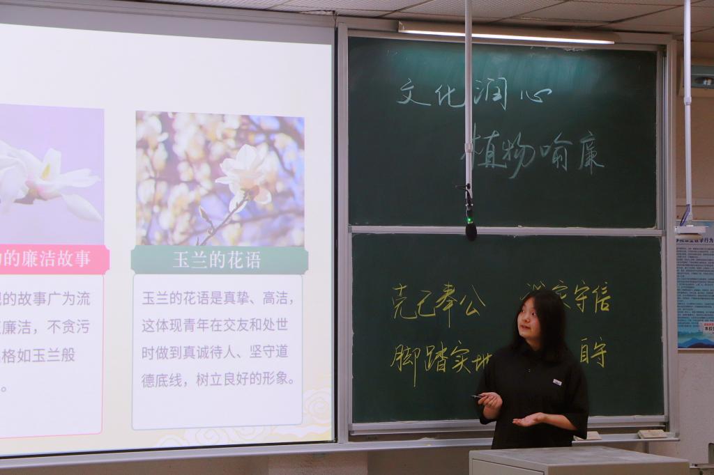 在“生”藏廉韵,“化”蕴清风主题植物展环节,黄星雨同学讲述玉兰的“净若清荷尘不染”,卢欣怡同学描绘梅花的“凌寒独自开”,通过展示“植物的坚韧与青年的厚积薄发、植物的高洁与青年的廉洁”等以“形”传廉。在十指“廉”心手工作品展环节,七名同学用精心制作的莲、桂、兰手捧花,梅、菊、竹相框等作品依次亮相,通过指尖艺术将莲花“出淤泥而不染”的特质和兰花“幽谷传香”的品格灯具象呈现,以“境”悟廉让廉洁从“概念”变为“可触可感”的沉浸式体验。在清风入画廉洁植物手绘画展示环节,黄舒楠同学笔下的菊花尽显“不是花中偏爱菊,此花开尽更无花”,宋思思同学勾勒的百合“清香自信高群品”,以“艺”述廉让植物成为廉洁的生动注脚,让师生们在自然意象中感受清廉文化的浸润。此外,活动作品展区内,各类廉洁主题作品琳琅满目:竹叶、莲花等样式的发簪,桂花、铃兰等样式的胸针,“梅兰竹菊”四君子样式的扭扭棒作品,莲花、栀子花样式的折纸作品,竹影摇曳、兰草幽姿与廉洁名句完美交融的书签作品……通过“文化+廉洁”的创新形式,“廉”之美、“廉”之姿、“廉”之韵得以具象化,引得师生驻足细品。