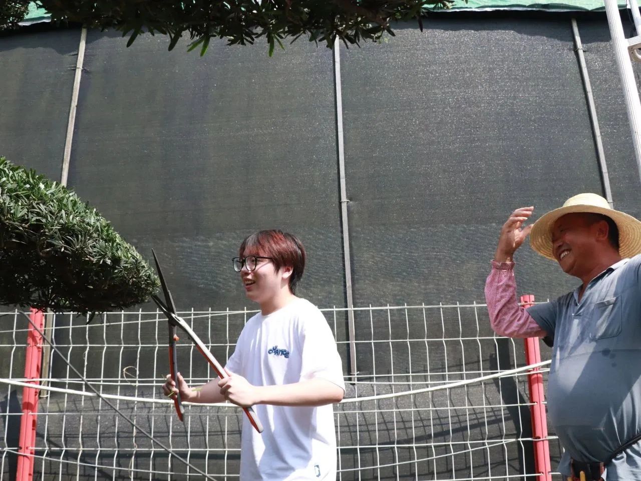 在柏衡园艺中,小熊阿姨给调研团们一一介绍:绑在树枝间的铁丝不是用来虐待它的,而是为了让他更好的定型;而那些还没有修剪的罗汉松并不是“任其飞翔”,而是为了让它继续生长从而获得更粗的圈口;长出来的小果子被摘取掉是为了保持沙土中的水分......通过一盆景观,收获满满知识,也让调研团成员们对花木产业的精细管理与艺术价值有了更深的认识。
