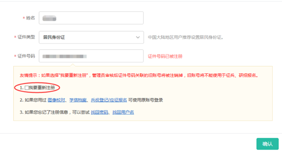 2、填写证件号码后提示证件号码已被注册,如何解决身份证号码重复问题?