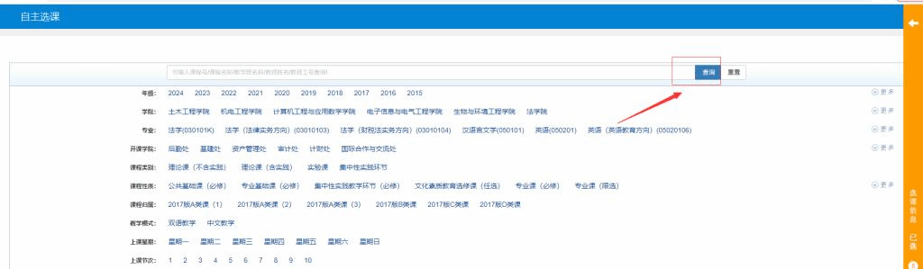 四、 在选课界面下,请先点右上角的查询按钮,查询出选课列表(电脑见图6和图7),进行选课和退选(电脑见图8)。