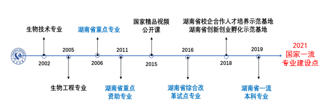 历史沿革:专业前身为2002年开办的生物技术专业,2005年升格为生物工程本科专业,是湖南省重点专业(2006)、湖南省资助专业(2011)、湖南省综合改革试点专业(2016),湖南省一流本科专业(2019),国家一流本科专业建设点(2021)。
