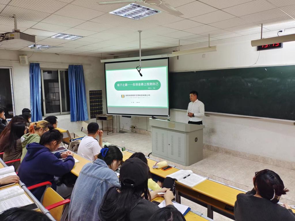 湖南海泰博农生物科技有限公司近几年与生化学院在科学研究、项目申报、本科生生产实习、毕业生就业等方面开展了深度合作。此次公司总经理邝鼎应邀走进课堂,为生物工程专业大三学生做专题报告。报告中,邝鼎总经理首先介绍了公司的基本情况和发展历程。然后,与同学们分享了他大学毕业之后的创业经历,结缘栀子,专注栀子,打造了从栀子培育、种植、深加工到品牌塑造的国内最完整的栀子全产业链,实现了传统农业到现代高科技农业的转型。邝总的报告非常精彩,同学们对邝总强调的科学技术是成功创业的智力支撑有了新的认识。报告结束之后,邝总就同学们关心的就业和创业问题与大家进行了广泛的交流,现场气氛活跃,大家踊跃发言、深入交流。