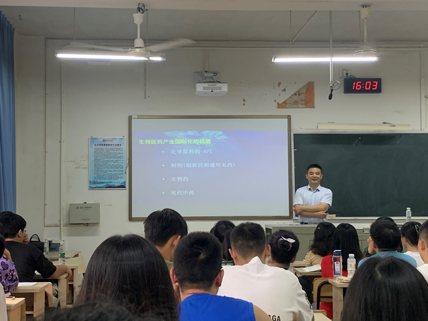 湖南醇健制药科技有限公司与生化学院自去年签署战略合作协议以来,双方在科学研究、人才培养、毕业生就业等方面开展了积极合作。此次公司总经理吴四清应邀走进课堂,为生物制药专业大四学生做专题报告。报告中,吴四清总经理首先介绍了生物医药产业国际化的机遇,讲述了生物医药研发的国内外形势和政策,详细介绍了原料药生产的关键步骤、关键工艺参数、安全性评价以及质量管理要点,最后吴四清总经理结合个人成长、学习以及工作经历来谈新时代我们如何迎接生物医药所面临的机遇和挑战。报告会结束后,我校师生就创新药的开发、就业和实习定位等问题积极向吴四清总经理请教交流,现场气氛活跃,大家踊跃发言、深入交流,再一次将讲座推向高潮。
