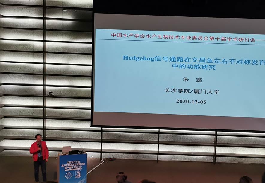 中国水产学会水产生物技术专业委员会第十届学术研讨会于2019年12月4-5日在汕头召开。我院生物学科三位教师应邀参会,褚武英教授应邀主持了本届水产生物技术学术研讨会水产种业生物技术的转化与应用分会场学术报告。我院青年教师朱鑫在会上作了题为“hedgehog信号通路在文昌鱼左右不对称发育中的功能研究”专题报告,对物种演化节点生物文昌鱼左右不对称发育机制进行了汇报,并进一步探讨了hedgehog信号通路在重要经济鱼类鳜鱼肌肉品质形成与调控中的应用前景,报告受到与会专家的广泛关注。青年教师潘亚雄提交了“基于全基因组水平鳜鱼肌球蛋白重链基因家族鉴定及表达分析”会议摘要,从全基因组水平系统鉴定了鳜鱼肉质形成关键因子MYH不同亚型,并对其在鳜鱼红白肌中的表达分布进行了分析。