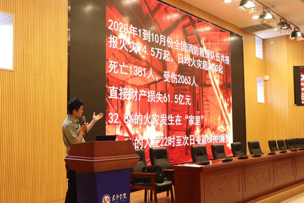 大会第二阶段是宿舍消防安全专题培训。来自湖南全安消防培训公司的曾令斌教官为大家详细介绍了火灾的危害性和预防措施。随后,他分享了各类典型的火灾案例(特别是发生在学生寝室、化工实验室、人员聚集的小区等处的火灾案例),帮助同学们深刻认识安全生产工作的极端重要性。最后, 他从“杜绝消防隐患,从源头消灭火灾”“掌握火场逃生技能”“灭火器、防毒面具的使用”等方面提醒同学们珍爱宝贵生命,远离火灾隐患。
