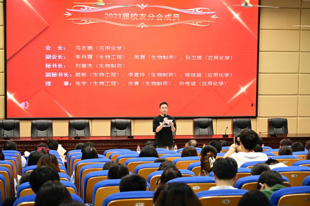 学院2023届校友分会全体成员集体上台亮相,会长马志鹏同学作表态发言。他表示:饮水思源母校恩,校友会全体成员不会忘记母校的栽培和师友的情谊,将同根同源、同向同行!