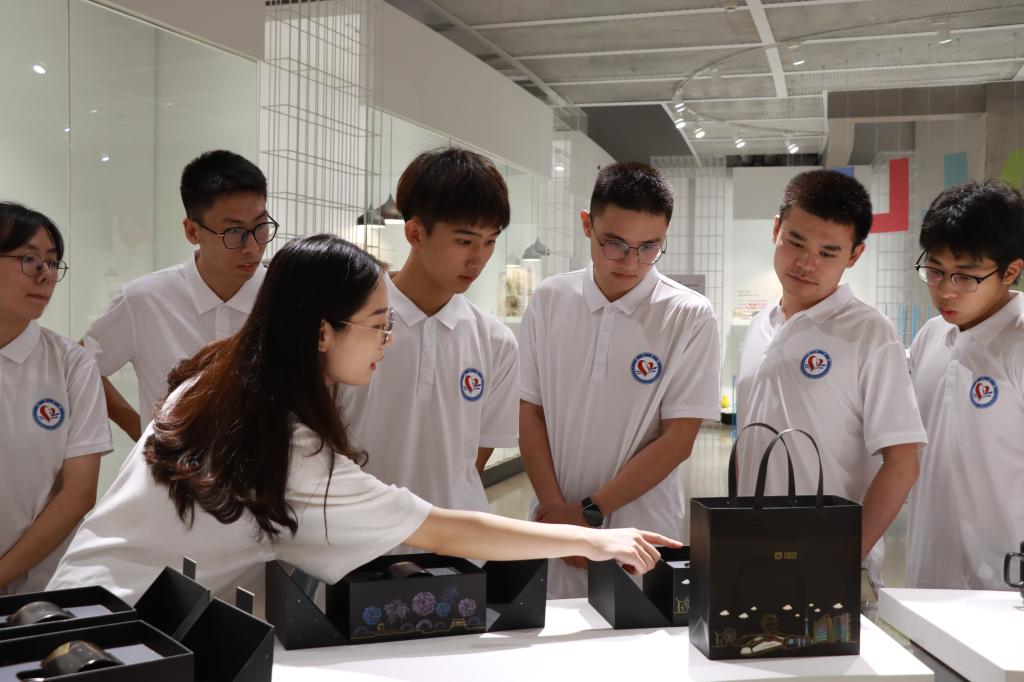 图为陶润会工作人员为实践队员讲解升温变色马克杯等一系列创新产品的创作灵感、原理及纪念意义,何嘉玲 摄