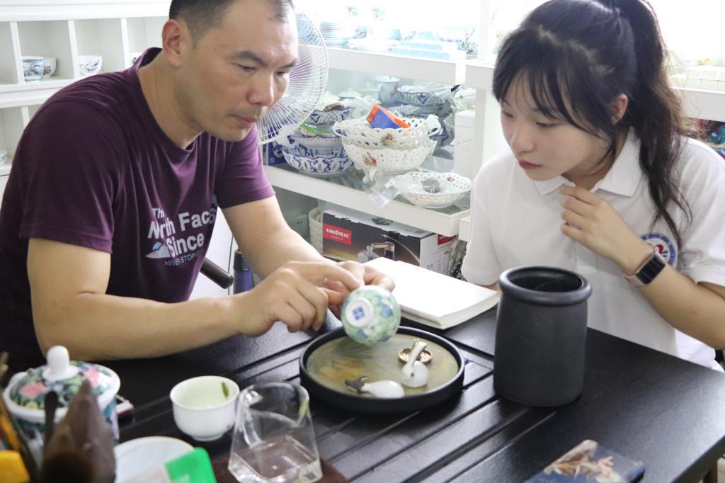 图为醴陵陶瓷花炮大市场店主张敏为实践成员讲解釉下五彩瓷的特点,周影锋 摄