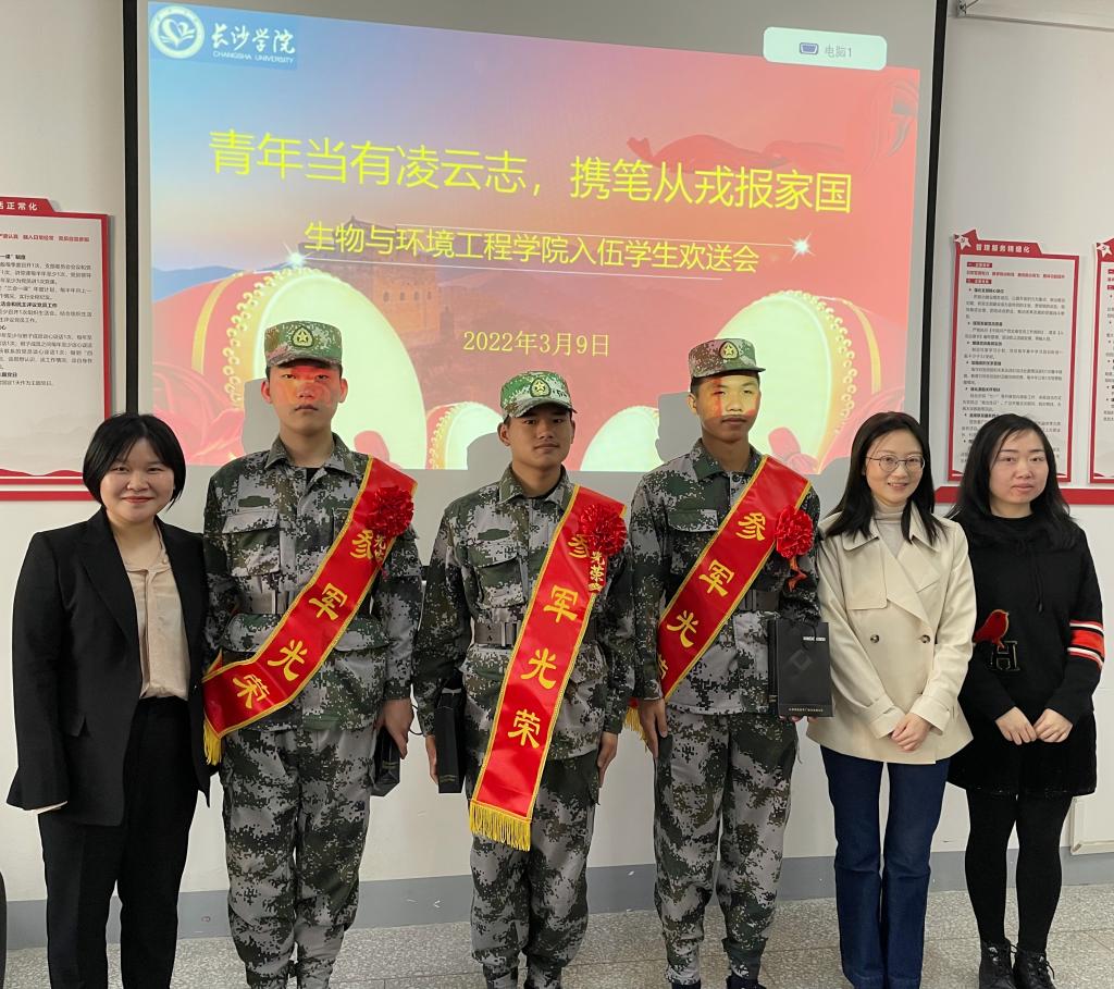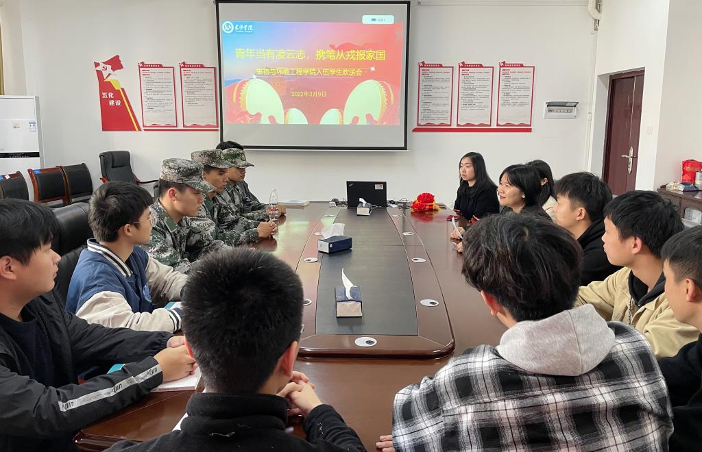 身戴红花着戎装,雄姿英发踏征途。3月9日下午,生物与环境工程学院在力行楼S418会议室为2022年春季入伍的苏文易、王恺昕、石语昆3名同学举行了隆重的欢送会。20级辅导员刘芳萍、班主任刘芳出席活动,3名退役老兵和部分学生代表参加了欢送会。欢送会由学院党总支副书记姚玲主持。