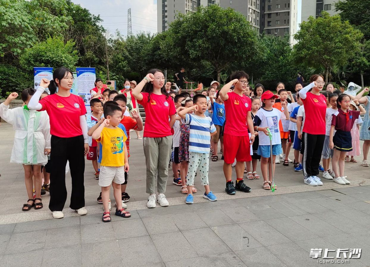 在双河社区广场,参加活动的百余名小学生在环保创客志愿者的带领下,举起右手,立下“绿色”誓言,争当长沙环保小卫士。同学们跟随志愿者分组进行垃圾捡拾,“还社区一片绿”就是他们践行誓言的生动体现。