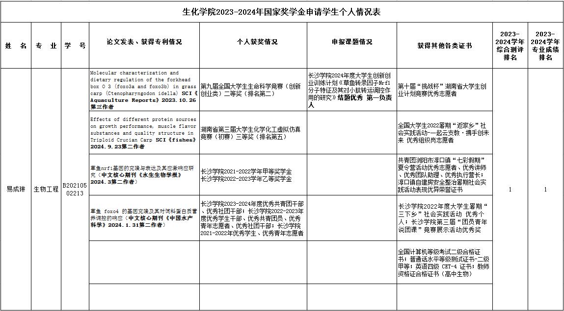 根据《关于开展2023-2024年国家奖学金评审工作的通知》(长大学工通 [2024]22号)文件精神,经本人申请,学院认真评审,现将生物与化学工程学院2023-2024年国家奖学金初审名单(第一批)予以公示,公示时间:2024年9月24日-9月30日,如有异议,请于公示期内向生化学院学工办0731-84261421或学校学生工作处0731-88097518反映情况。