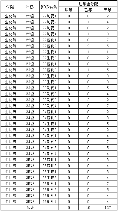 根据本年度学校分配予我院国家助学金的名额,我院根据学院各年级、各班困难生认定人数、等级及参评年级困难生总人数确定各年级各班级评选名额。本年度我院各年级各班级评选名额如下(附件1的特困、国奖、励志学生不占班级名额):