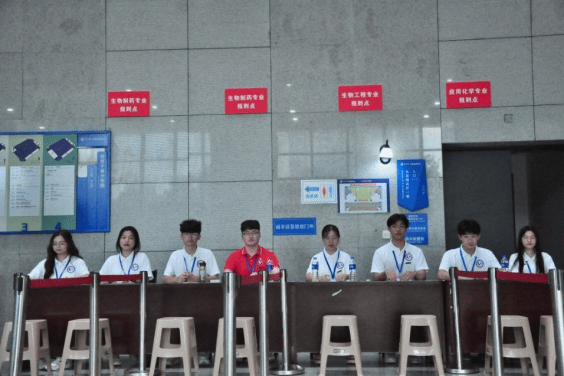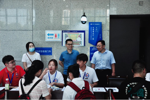 校门口及报到点上志愿者、班导和下班党员坚守岗位,为每一名新生提供热情、细致的报到服务。报到现场忙而不乱、井然有序,新生老生热情洋溢、欢声笑语。