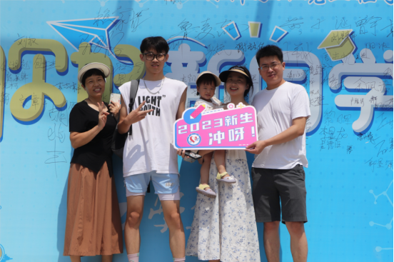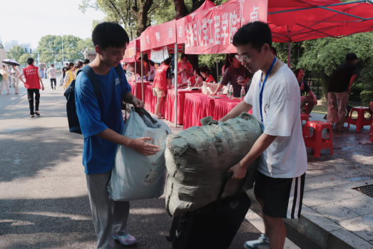 正午的阳光带来一波波热浪,被汗水浸湿的工作服,贴在前额的鬓发,新校门、报到处、力行楼、宿舍间往返奔忙的身影是迎新志愿者们的工作勋章。