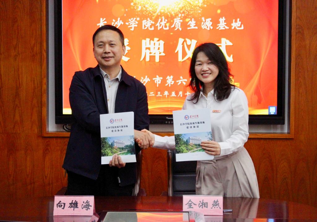 (长沙学院生物与化学工程学院党总支书记全湘燕和长沙市第六中学党委副书记、校长向雄海现场签署协议)