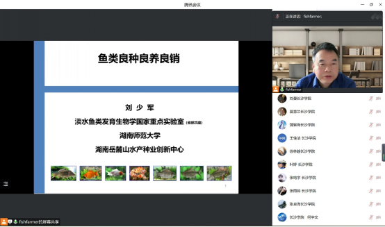 2023年4月30日上午,湖南师范大学中国工程院院士刘少军教授为我校生物专业本科生和研究生开展题为《鱼类良种良养良销》的线上讲座。刘少军院士长期从事鱼类遗传育种研究,创建了新的鱼类种质资源,研制了一批优良鱼类,建立了鱼类远缘杂交理论体系,系统揭示了杂交鱼的遗传特性和杂交鱼的繁殖特性。
