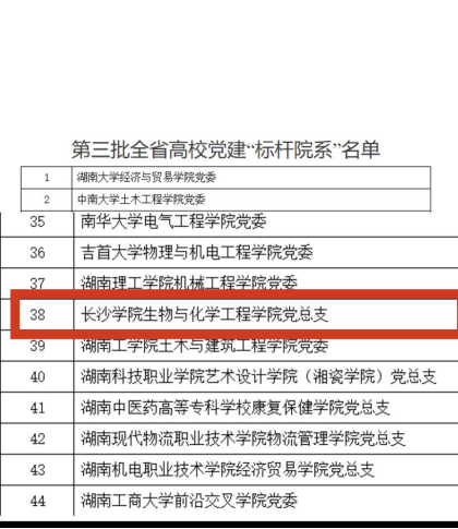 近日,中共湖南省委教育工委发布了《关于公布全省高校党组织“对标争先”建设计划第三批项目评选结果的通知》(湘教工委通[2023]4号),确定了第三批全省高校党建工作示范高校7所、标杆院系51个、样板支部100个、“双带头人”教师党支部书记工作室培育创建单位11个、“双带头人”标兵102名、党务工作示范岗102个、青年教工党员示范岗101个。长沙学院生物与化学工程学院党总支获评全省高校党建“标杆院系”。