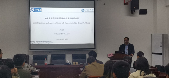 2021年11月16日下午,应生物与环境工程学院邀请,中南大学化学化工学院院长、博士生导师刘又年教授在学校力行楼S419做题为《纳米催化药物体系的构建及生物医药应用》的学术报告。报告由褚武英院长主持,应用化学、功能材料、生物工程、生物制药专业部分教师及学生参加了本次报告会。