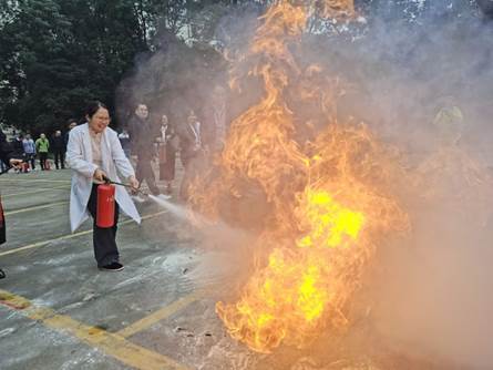 讲座结束后,学院还组织了教职员工开展应急消防演练。力行楼演练区域浓烟迷漫,随着警报声的响起,老师们纷纷离开办公区域,沿着逃生楼道,安全有序撤离“火灾现场”。在户外灭火演练中,老师们轮流实操,大家手拿灭火器,按照“一拔二瞄三喷”的使用步骤,对准火险位置进行喷射灭火。演练结束后,老师们纷纷表示“此次消防知识培训和实操演练增强了自己的消防安全意识,提高了自己应对火险事件的应急处置能力,特别有意义”。
