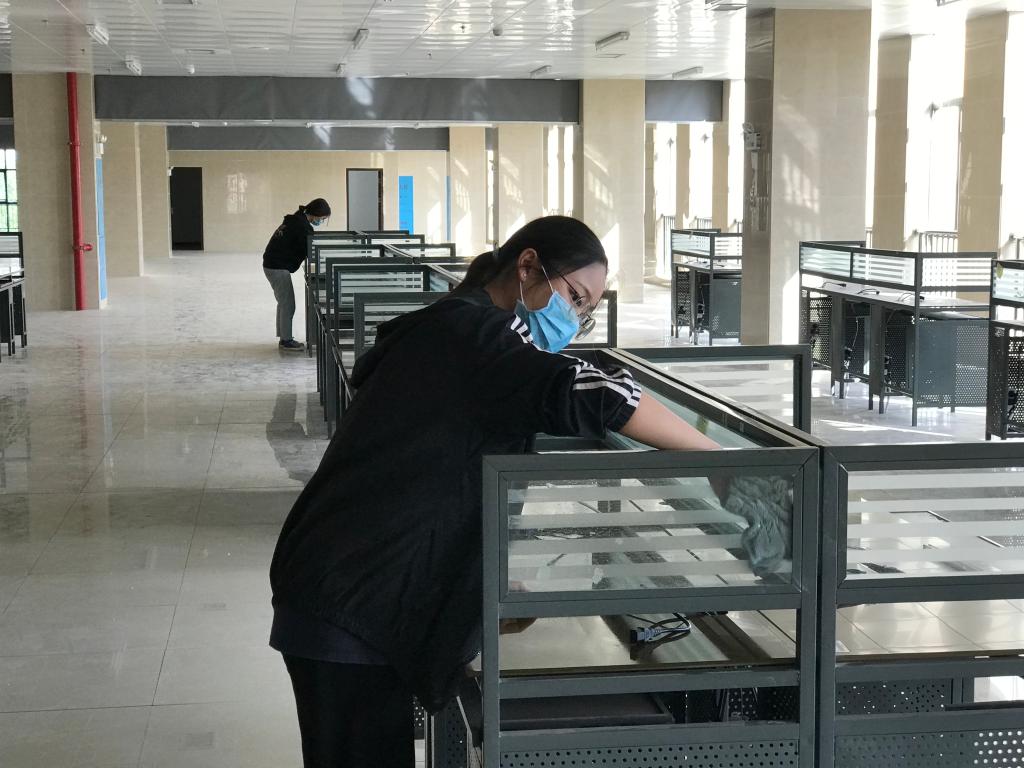 本次志愿活动的任务是对新图书馆四至六层的书架进行除尘。同学们五人一组,分工明确、团结协作,他们不怕苦、不怕累,仔细擦拭着书架的每一个角落。17级环境工程专业的唐榕霞同学作为本次发展对象,负责带领同学们打扫三楼电子阅览室。她自大一进校起就加入长沙学院造血干细胞宣传服务队,多次参加无偿献血宣传、禁毒防艾宣讲及“关爱白血病儿童”活动,她把在服务队学到的志愿者精神,带到了这次新图书馆的清扫活动中,她表示以后会继续弘扬奉献精神,并传递给更多同学。