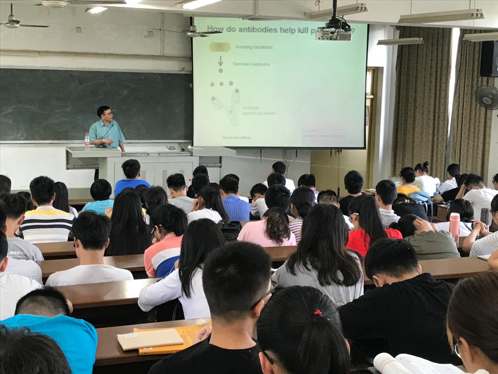 日前,根据湖南省海外名师管理办法,湖南省海外名师、英籍华人、英国Aberdeen大学生物与环境研究所高级研究员邹钧来我校访问讲学。5月25日,邹钧为生物与环境工程学院硕士研究生和部分本科学生作题为《生物技术与水产疫苗》的学术报告,他系统介绍水产养殖品种、养殖品种与病害、病害与免疫、免疫与疫苗、疫苗与生物技术生产,水产动物疫苗开发原理、制作方法与流程、疫苗使用等。