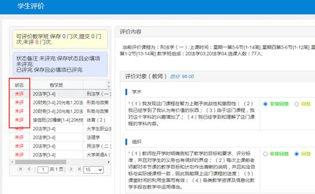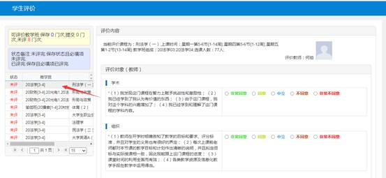 步骤四:在“教学评价”界面,在左侧选择需要评价的教学班,右侧为评价问卷。评价问卷包括客观题和学生评语两部分。对于“客观题”必须答完所有选项,才可以正常“保存”或者直接“提交”。如果课程评价后一旦点“提交”,则该课程就评价完毕,只能“查看”该课程的评价情况。如果一门课程评价完后点击“保存”以后,再进来可以修改评价信息。请同学们注意,所有问卷一旦提交将无法更改,请认真客观负责的评价。