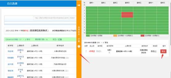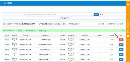 步骤五:点击选课后,已选课程右侧按钮会变成退课按钮,表明选课成功。