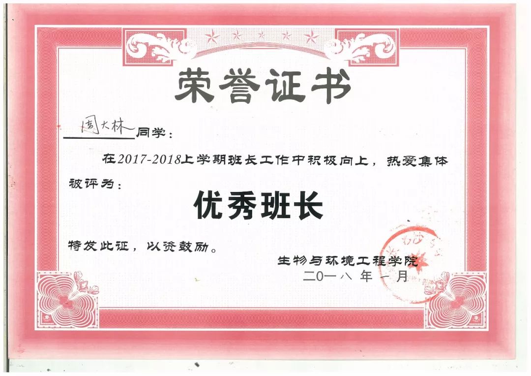 他是一名优秀的大学生,连续两年年度综合测评总分专业第一,并且连续两年获得国家励志奖学金;他是一名有责任意识的班干部,大学三年连续担任15生物工程一班班长一职,在与班上所有同学共同努力下连续两年获得“优秀班集体”和“优秀团支部”的称号,连续两年获得优秀学生干部和优秀学生的称号。